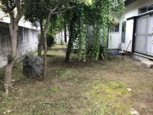 お庭に生い茂った雑草を刈り、整地、敷砂利いたしました。