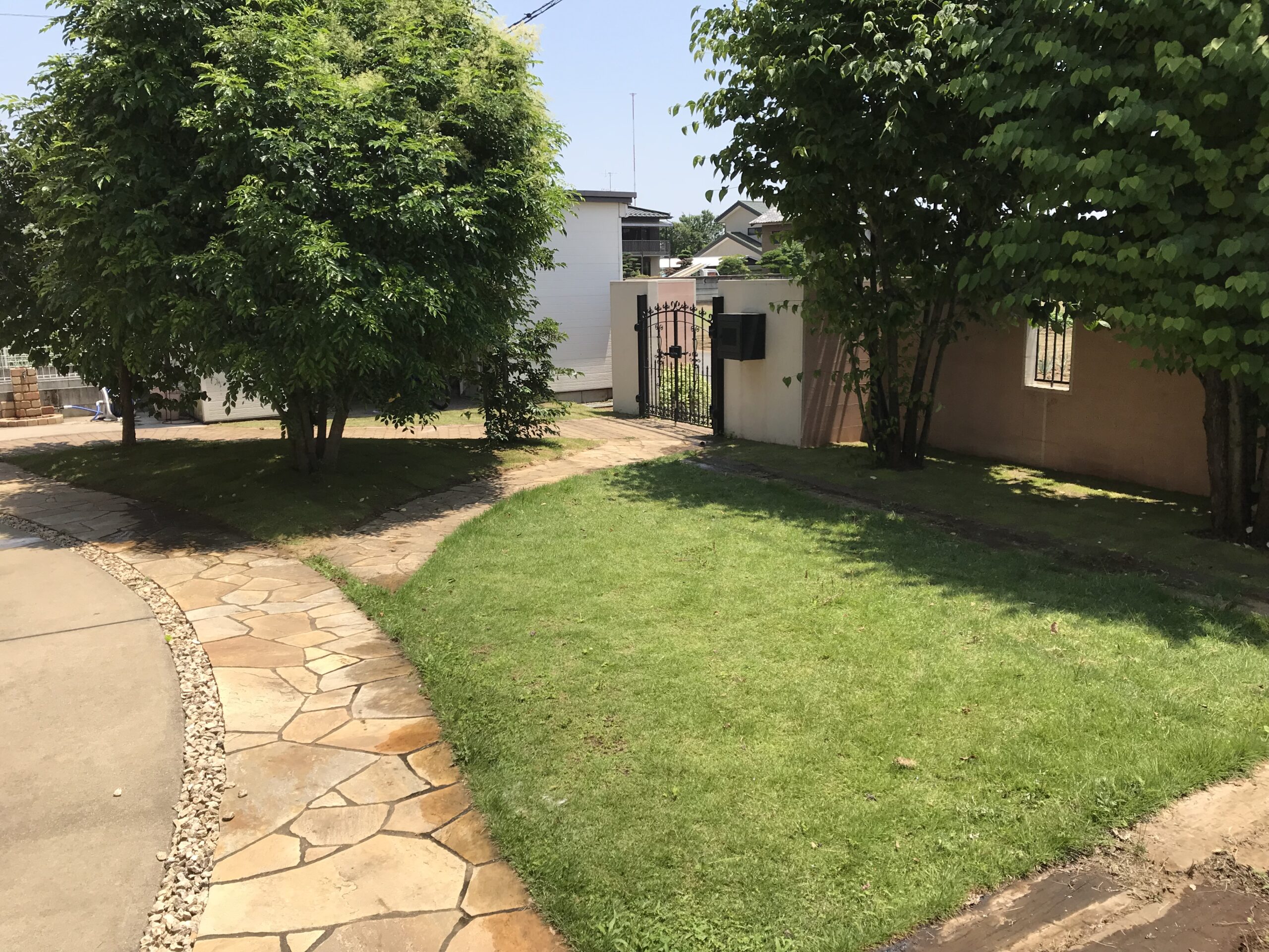 お庭に生い茂った雑草を刈り、整地、敷砂利いたしました。