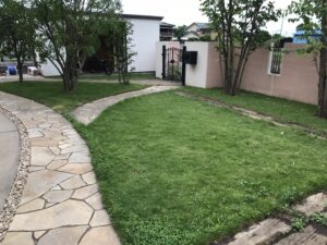 お庭に生い茂った雑草を刈り、整地、敷砂利いたしました。