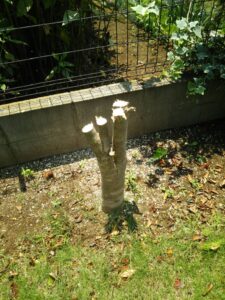 お庭の壁の際に植えていた植木を伐根いたしました。